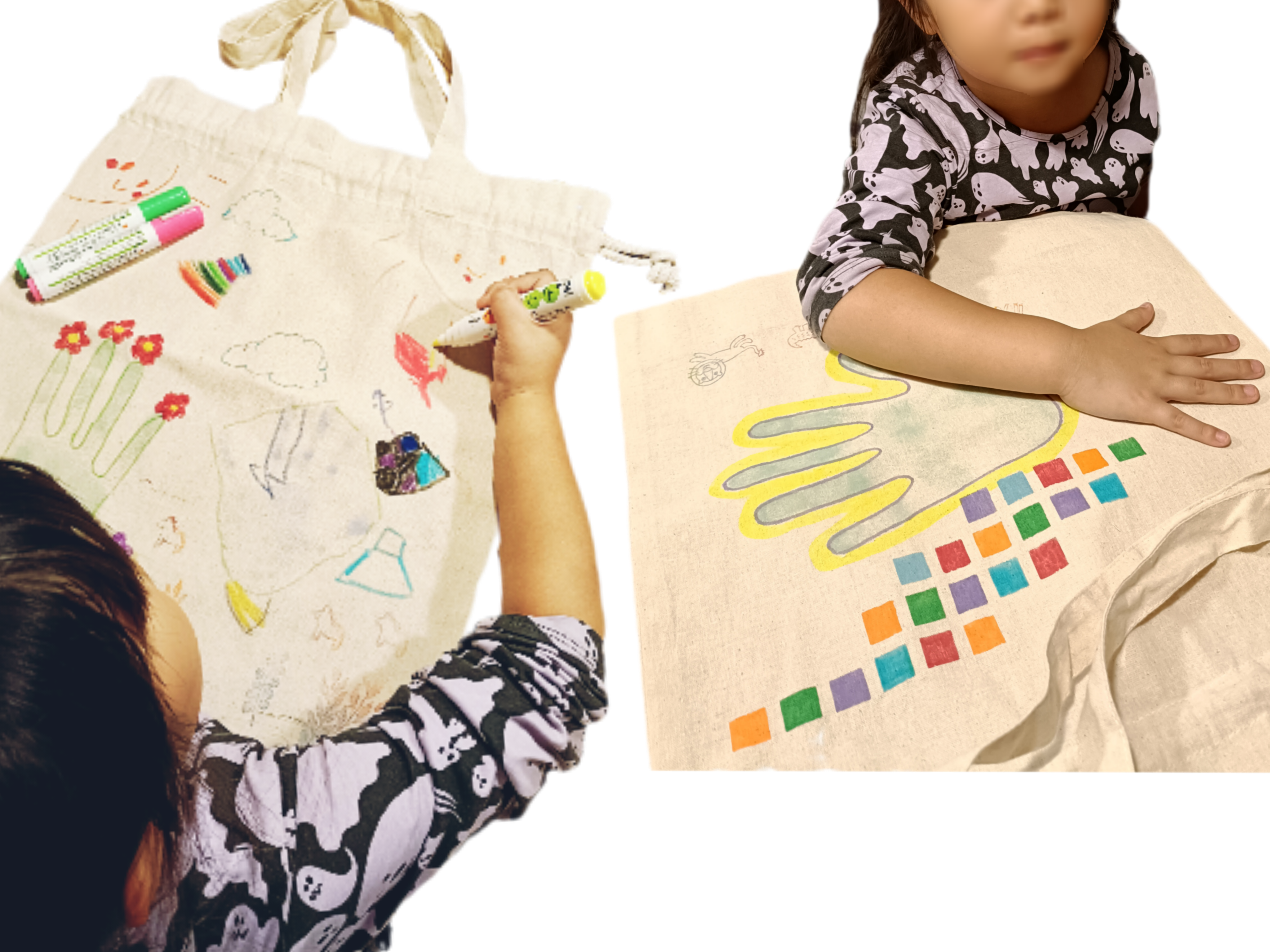 親子で楽しくアートタイム!世界にひとつだけの“マイエコバッグ”をつくろう!まっしろなバッグに、好きな絵を自由におえかき♪手形スタンプも押せます。