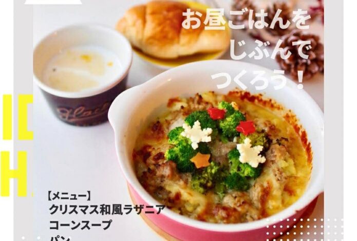 お昼ごはんを自分たちでつくってみんなで食べよう!最初から最後まで自分たちで作ります。お家でも作れるレシピ付き!クリスマス当日、楽しくおいしい思い出を作ろう✨メニュー・クリスマスラザニア・コーンポタージュスープ・パン…