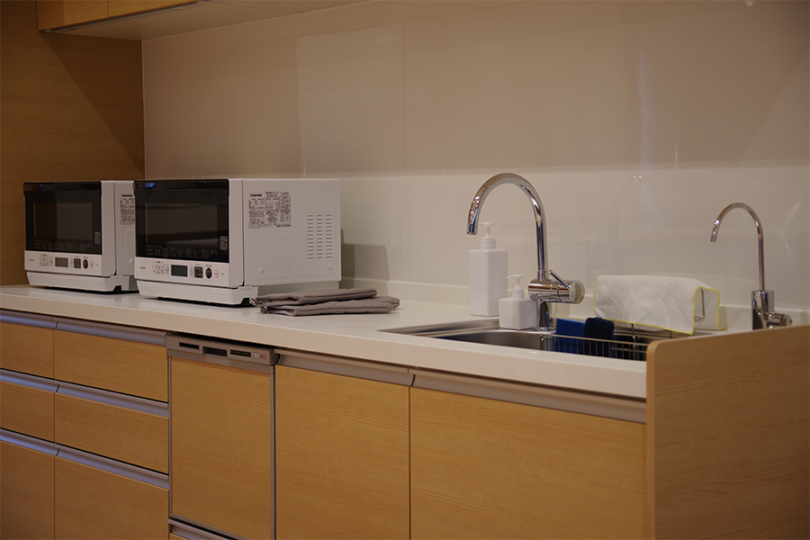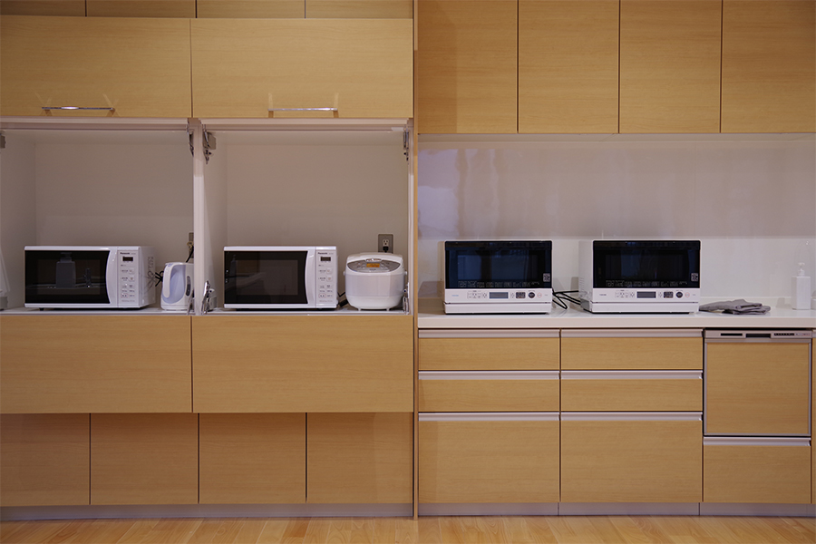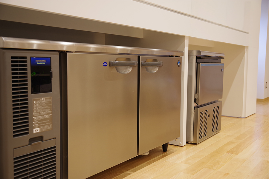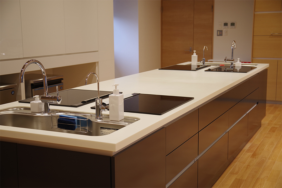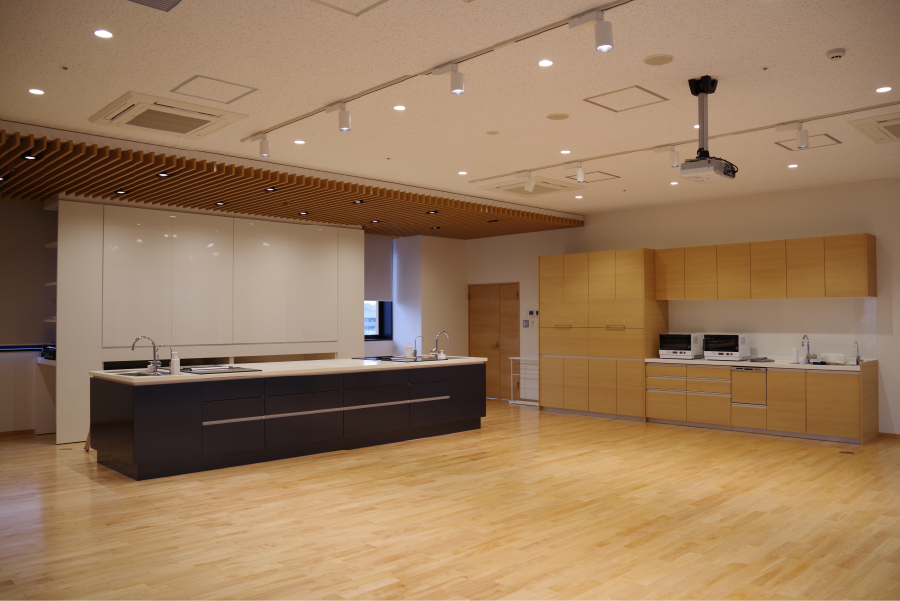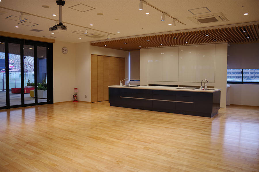 正面にIHキッチンを備えたレンタルスペースです。調理器具や製氷機も揃えていますので、料理教室やカフェイベントとしてご利用できます。 また、プロジェクターや音響設備も常備されているので、30名までの講演会やプレゼンテーション会場としても適しています。 通路側のドアは全面開放できるので、テラスを使ったマルシェやワークショップなどのオープンイベントの利用も人気があります。