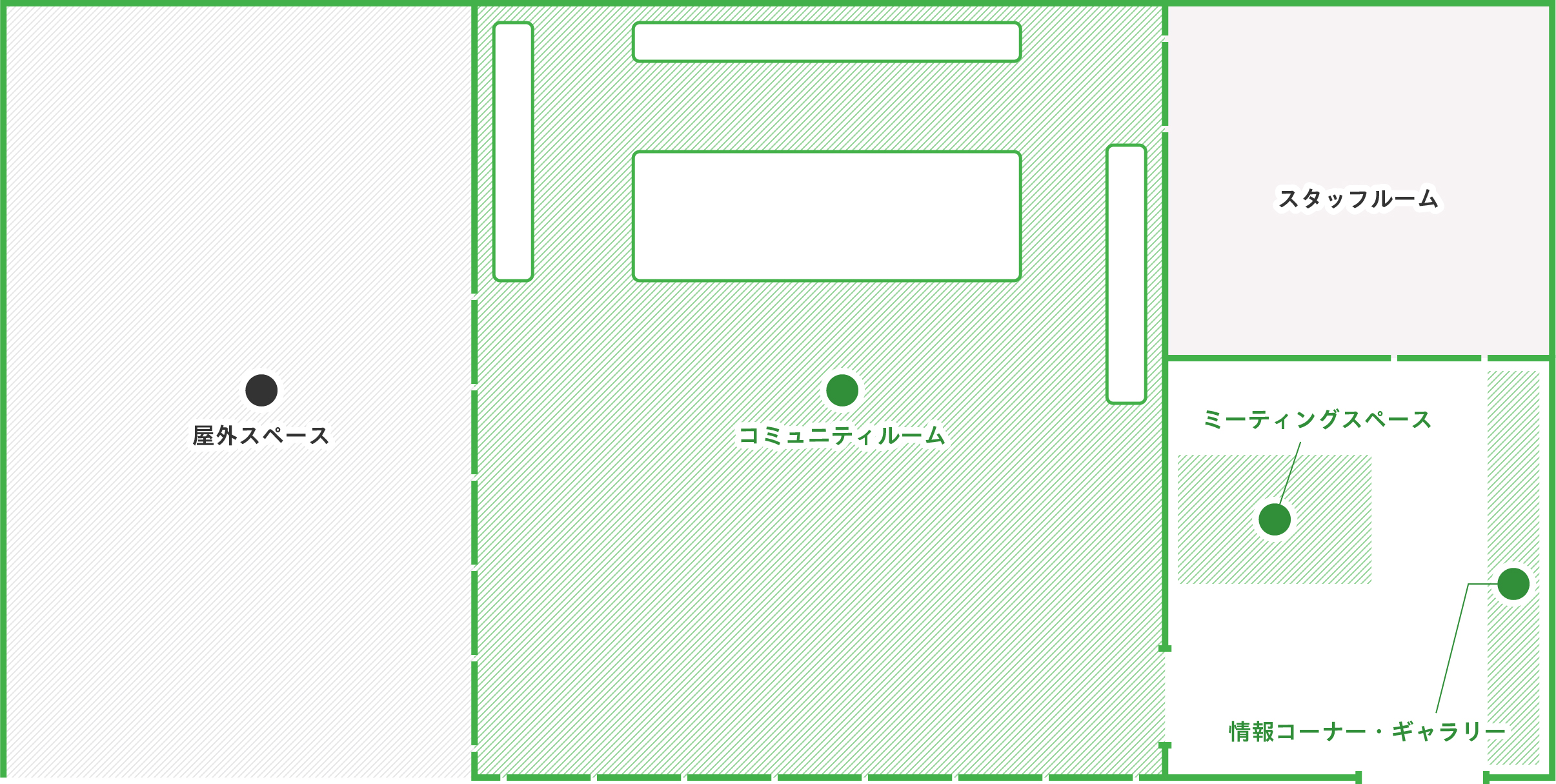 まちスポ福岡東には、「キッチン付きコミュニティルーム」「予約不要のミーティングルーム」「情報コーナー・ギャラリー」「屋外スペース」があります。地域の活動や展示にご活用ください。